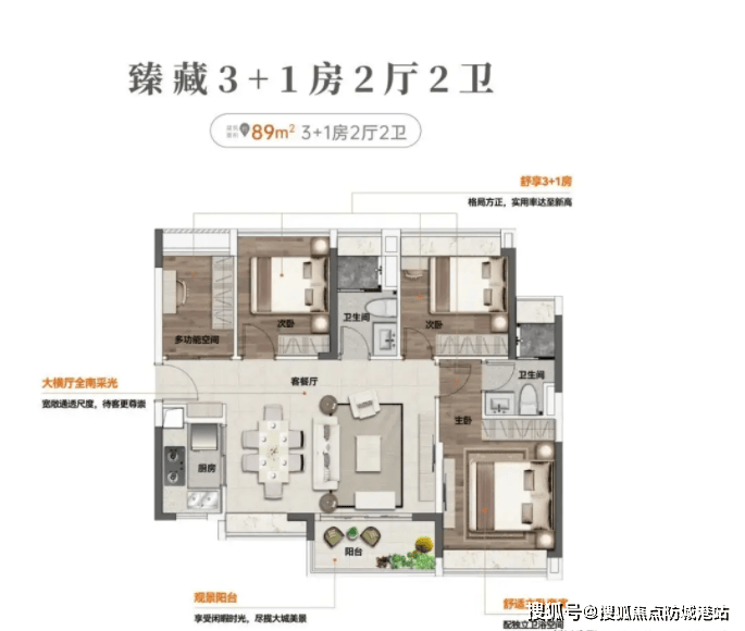 建面约89㎡四房两卫户型,延续了高适用率的特点,空间通透度较好。四房的设想使得每个家庭都能具有的私家空间,互不干扰。客堂面宽加大,采光面更广,营制出大气澎湃的居家空气。餐厨空间一体化设想,添加了家庭互动的乐趣。双阳台设置装备摆设,一个用于晾晒,一个用于休闲,功能分明,提拔了糊口的便当性。该户型出格适合生齿稍多的刚需家庭,或者对空间有必然要求的年轻改善群体。