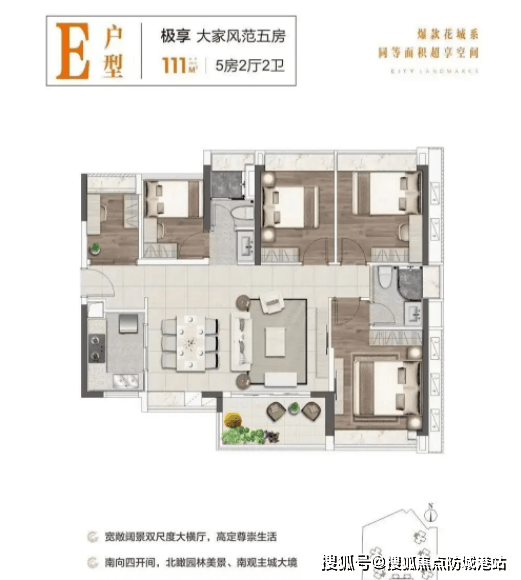 建面约111㎡五房两卫户型,总价344。1万元起,是项目中的楼王产物。其空间标准充脚,结构奢华大气。五房的设想供给了极高的矫捷性,能够按照家庭需求规划。除了常规的卧室、客堂、餐厅、厨房外,还能够设置衣帽间、储藏室、影音室等功能区域,满脚多样化的糊口快乐喜爱。从卧套房设想,配备卫浴取步入式衣帽间,彰显了仆人的卑贱身份。宽景阳台横跨客堂取次卧,视野极佳,将小区的园林美景尽收眼底。